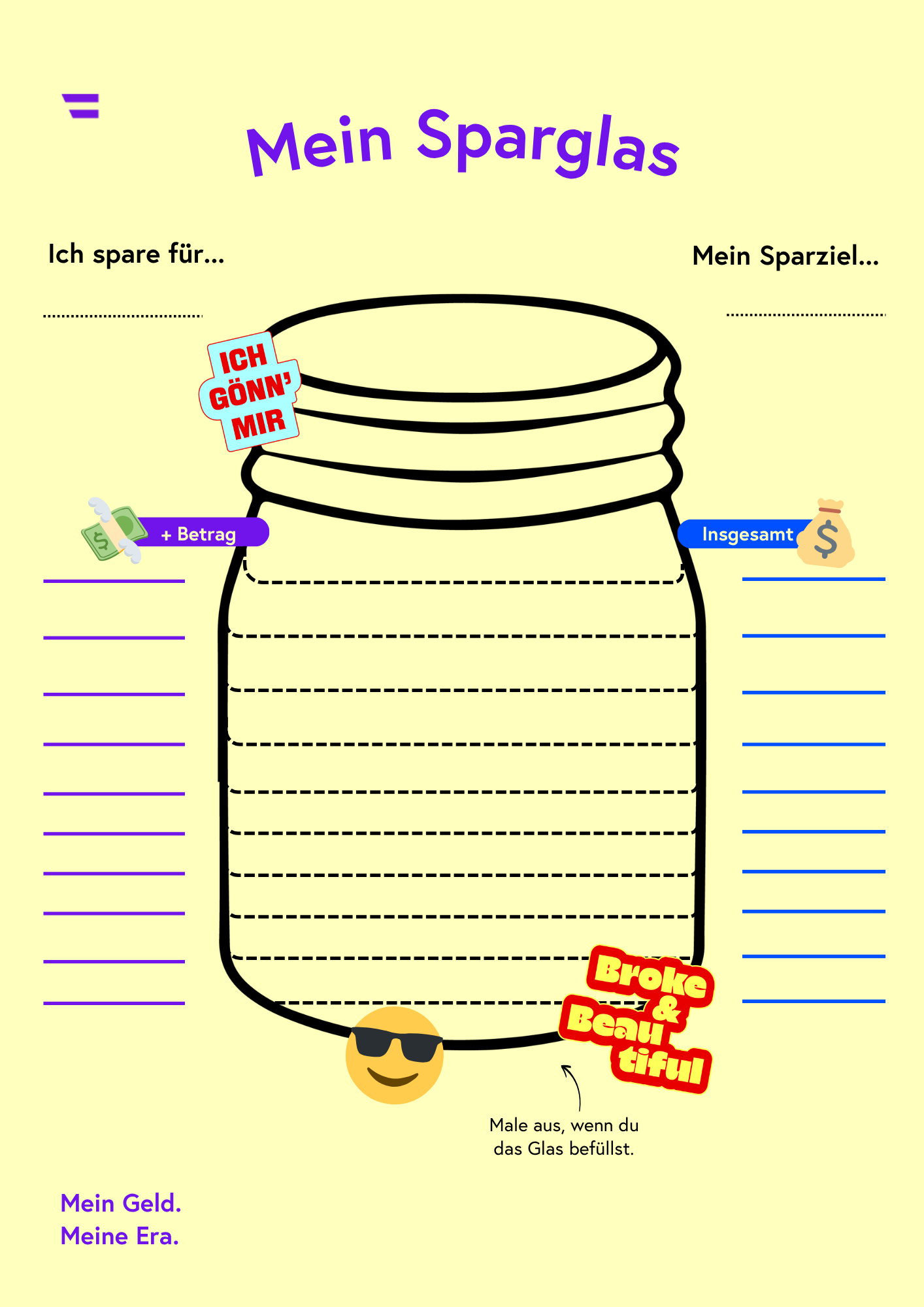 - Spare gezielt: Schreib dein Sparziel auf und hänge es dir in dein Zimmer oder mach es zum Hintergrundbild am Smartphone, z.B. „50 € für ein Konzertticket“ und in coolem Design. Das motiviert! Lade das Sparglas herunter – so siehst du deinen Fortschritt!